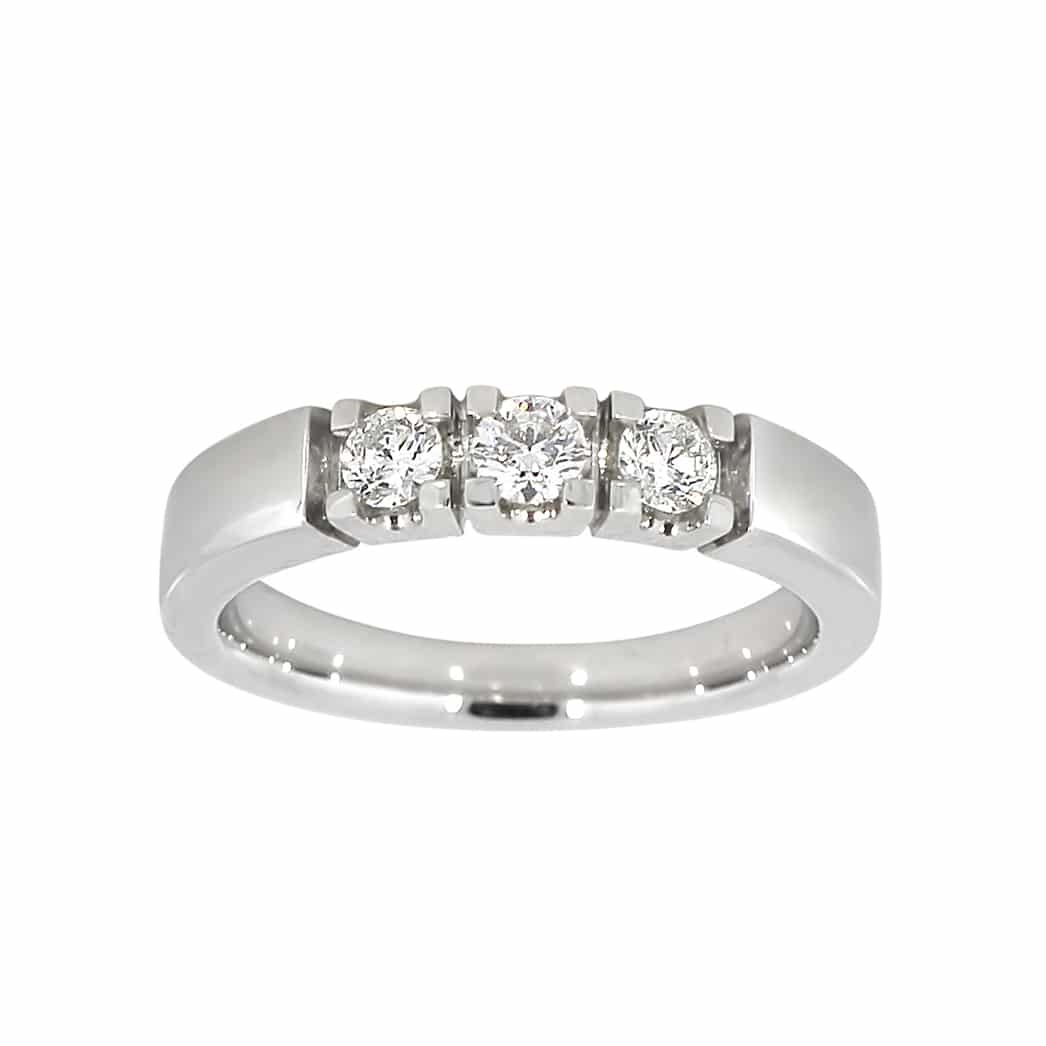 En klassisk og moderne alliansering i 585 hvitt gull, 3 diamanter á 0.07ct, tot. 0.21ct TWSI. Du kan bygge på med flere diamanter etterhvert. Ringen er ca 3mm bred.