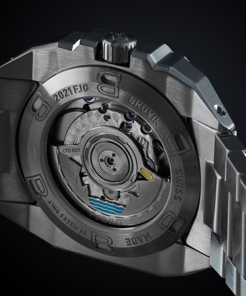 På baksiden av uret finner man en rotor med et unikt design med relieff som reflekterer inspirasjonen bak modellen. Dette er en klokke for den som ønsker å ta med et stykke norsk natur inn i det urbane liv.