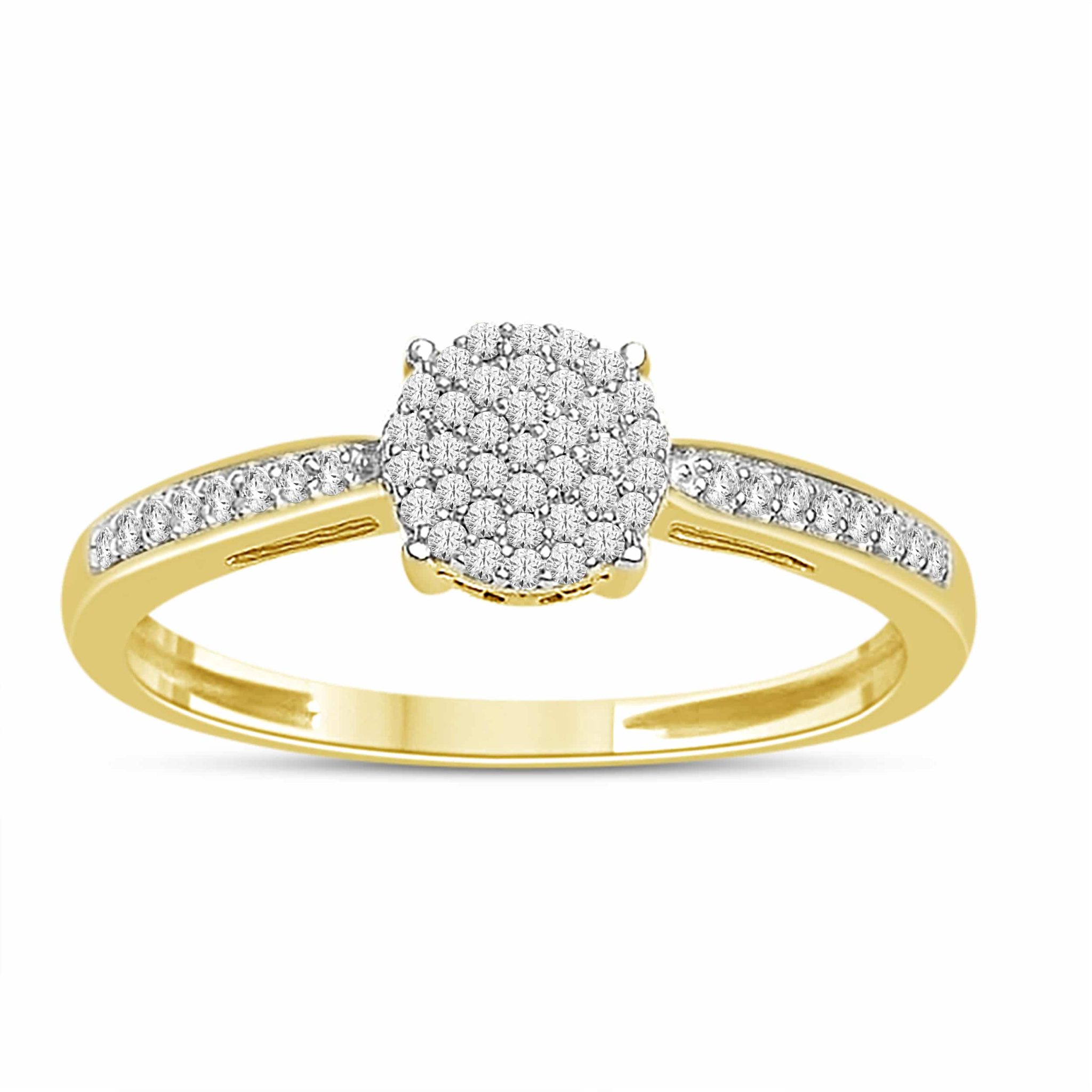 Nydelig diamantring i gult gull med mange diamanter som får ringen til å skinne. Med totalt 0,20ct tw/si kvalitet. Diamantene er fattet på skinne og har en rund topp med steiner som alle er brilliant slipte.