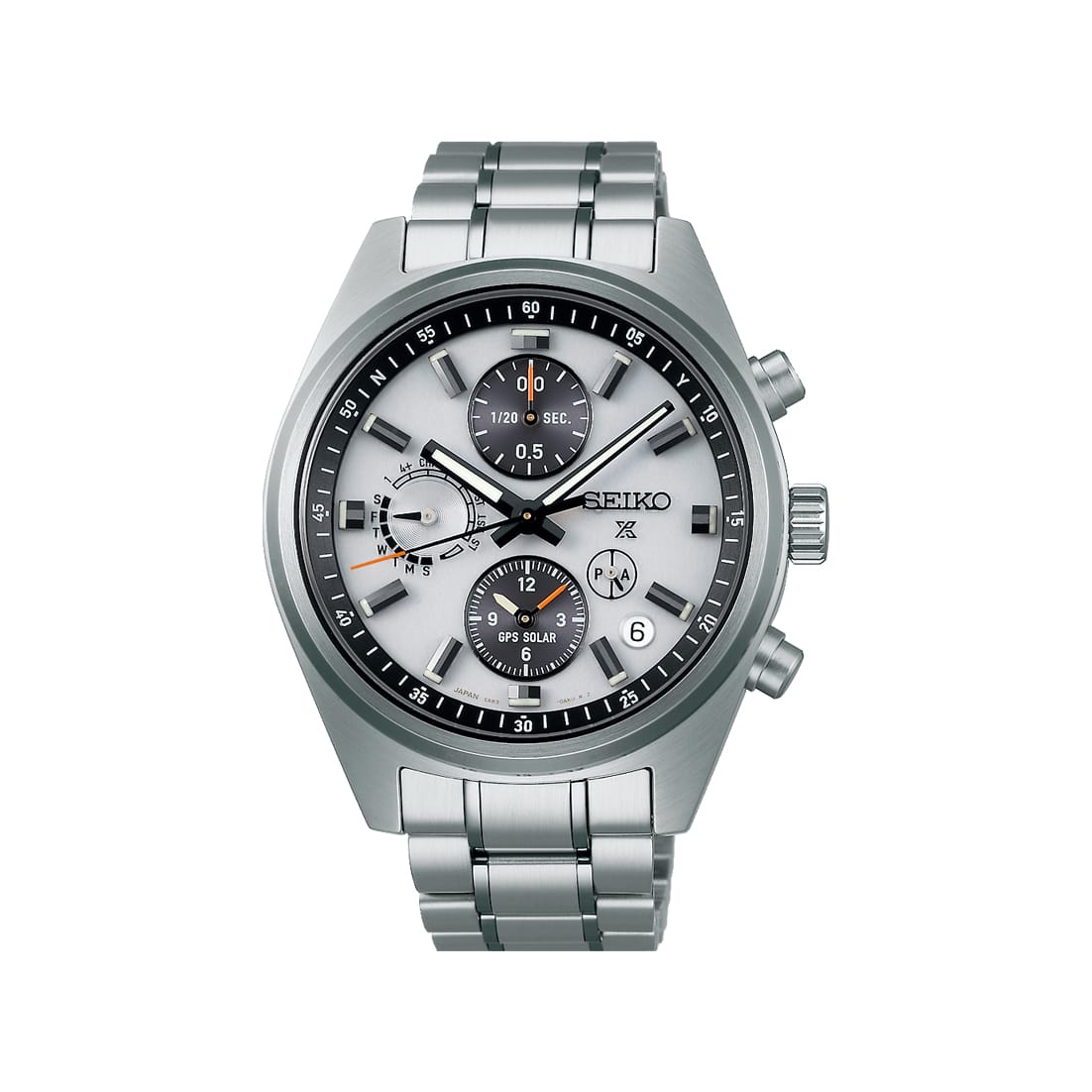 Under det dobbelbuede safirglasset finner du en dobbel tidssone-visning, em funksjon for rask justering av tidssoner og en tidsoverføringsfunksjon. Rundt kanten av den sølvfargede urskiven forbedrer denne GPS Solar-klokken kronograffunksjonaliteten med en kronografinndeling på den indre ringen. Lesbarheten til stoppeklokkefunksjonen er optimalisert ved å plassere UTC-tidssone-markeringene på siden av bezelen.