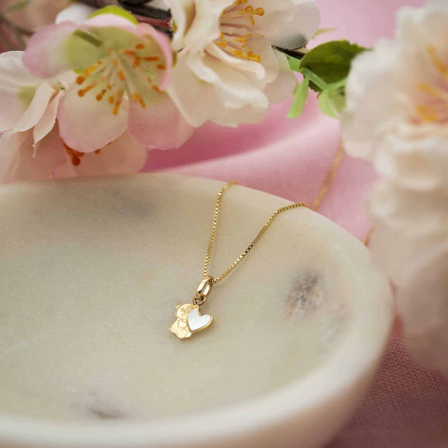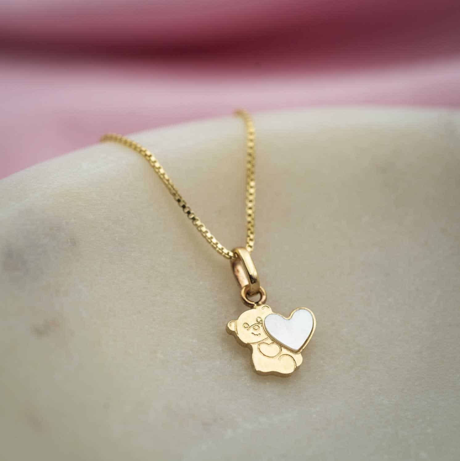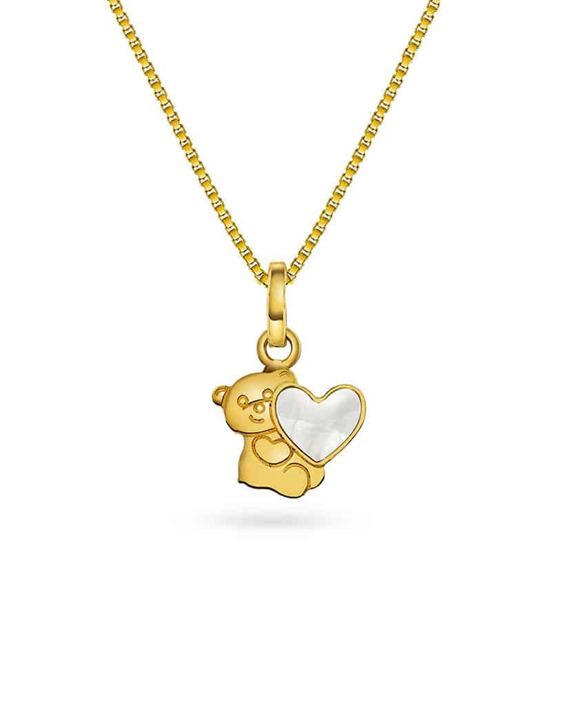 Smykke i gull med perlemor bamse