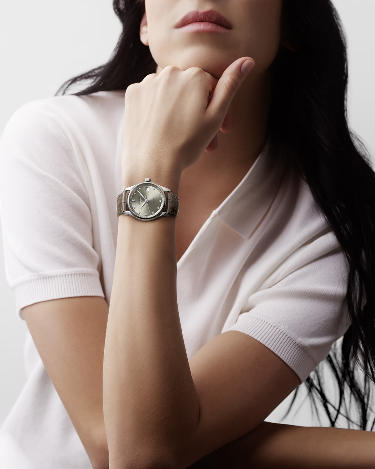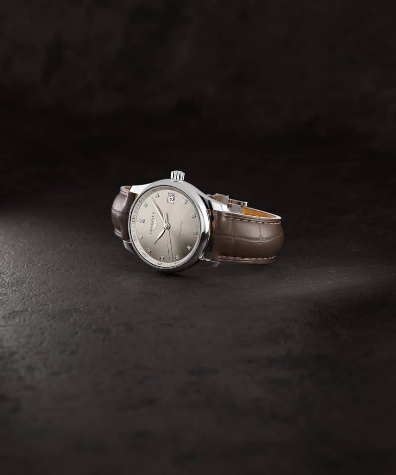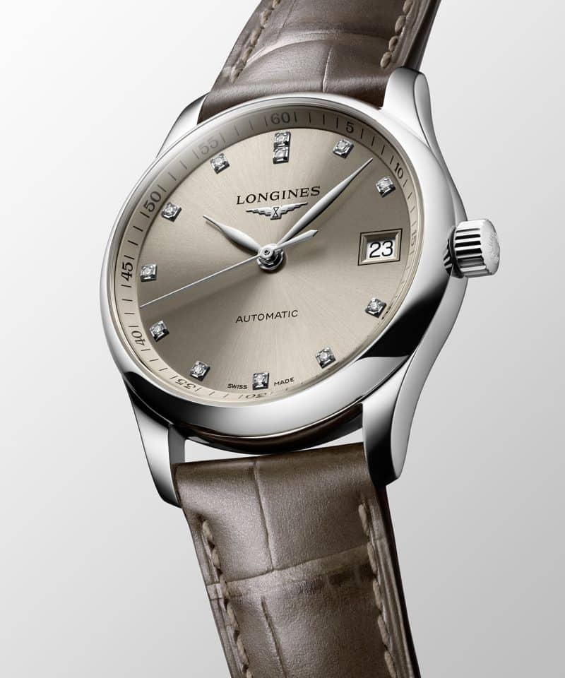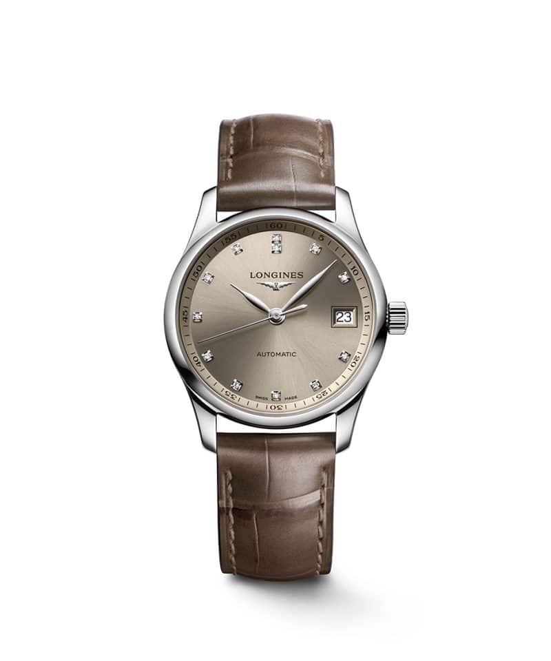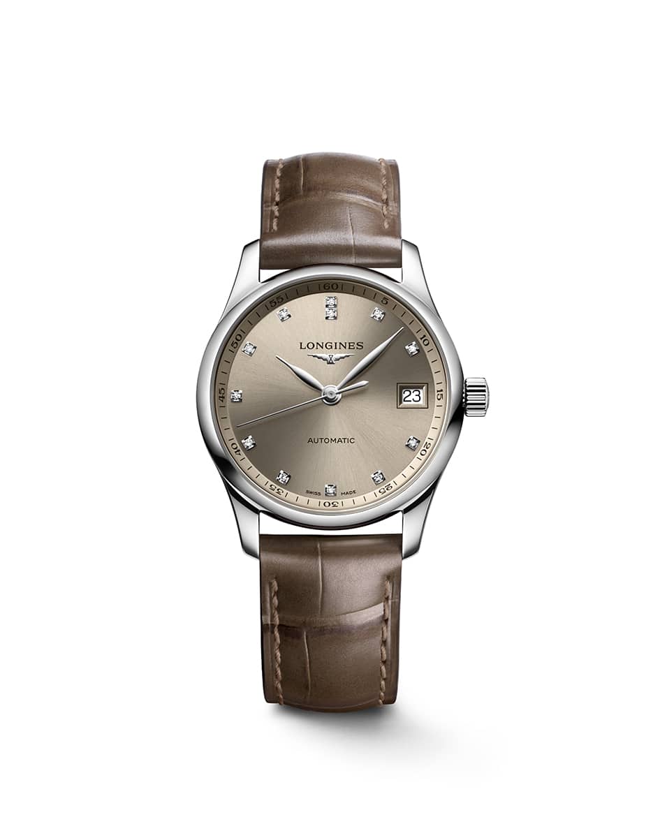 Longines Master Collection har blitt utvidet med nye, desidert mer feminine versjoner med 34 mm diameter. Drevet av et mekanisk selvopptrekkende kaliber, er denne versjonen utsmykket med en iriserende taupe lærreim og en champagne solstråleskive.