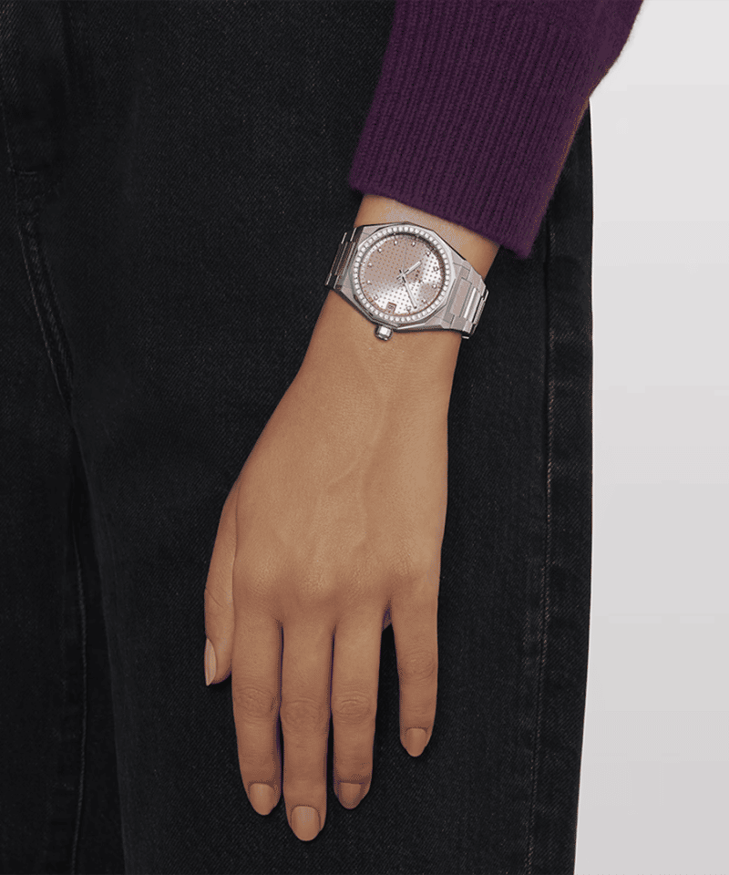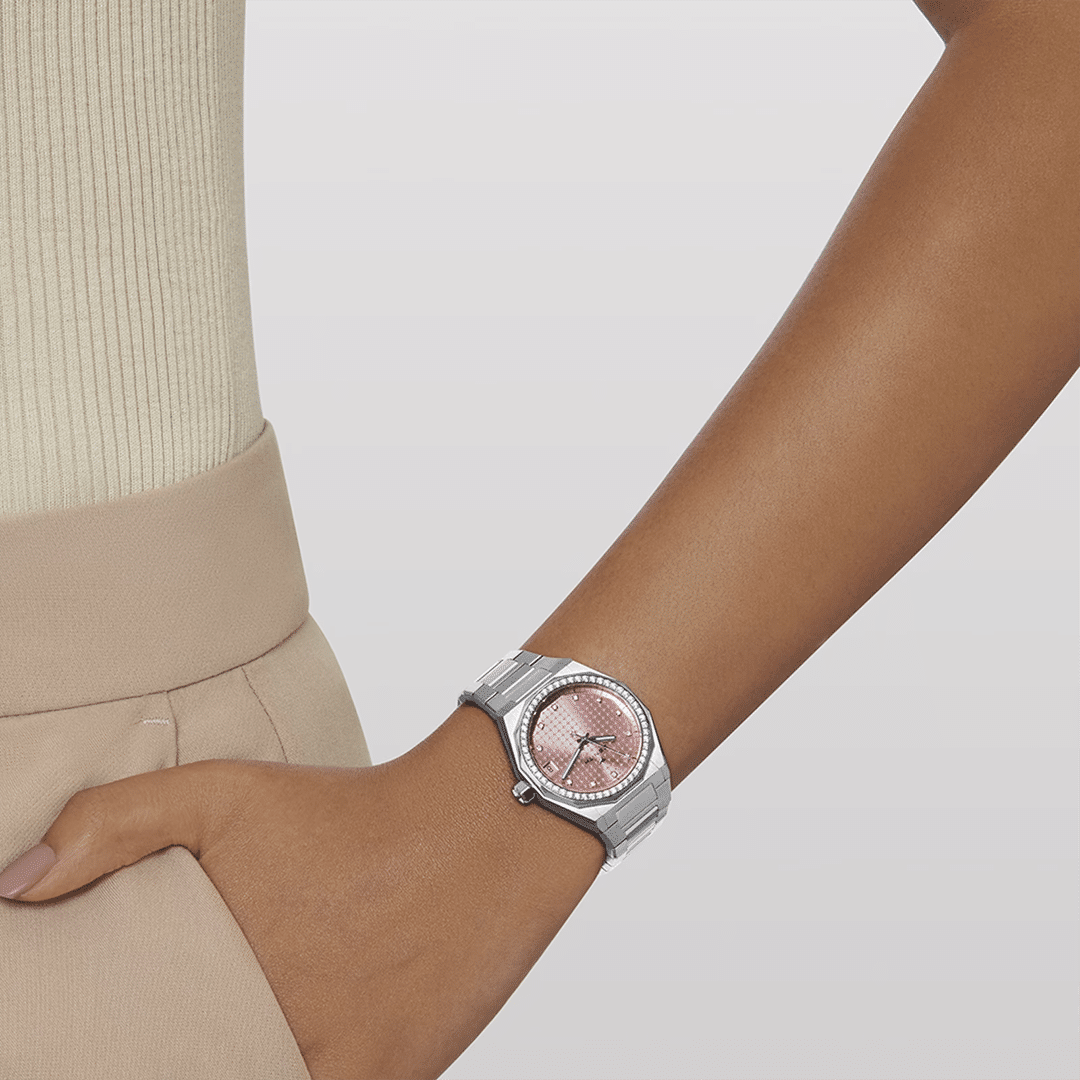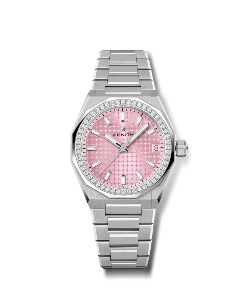 Defy Skyline i et 36mm åttekantet kasse av stål med fasettert diamantinnfattet bezel, med en metallisk pastellrosa sunburst tallskive. Drevet av kaliber Elite 670, et automatisk manufakturverk med 50 timer gangreserve. Leveres med en utskiftbar stållenke.