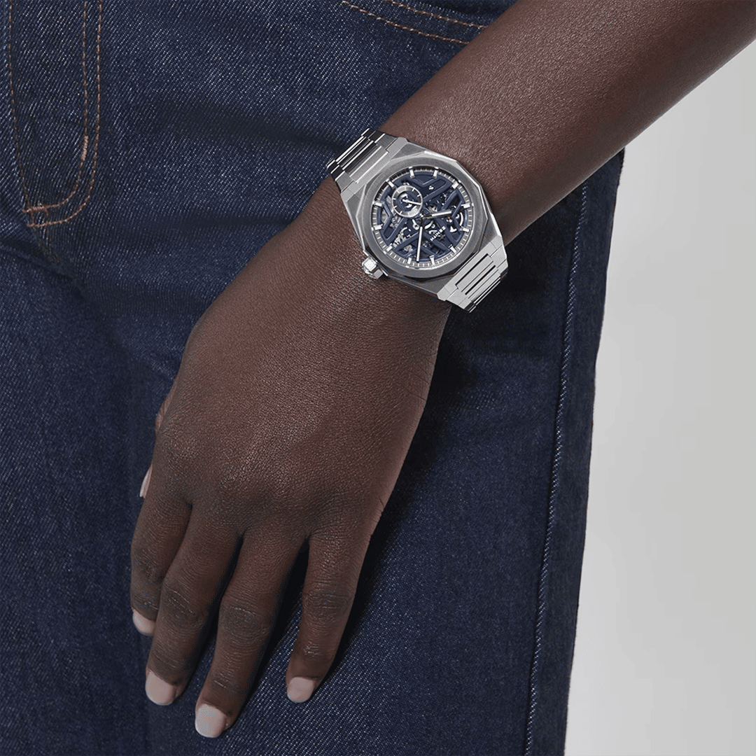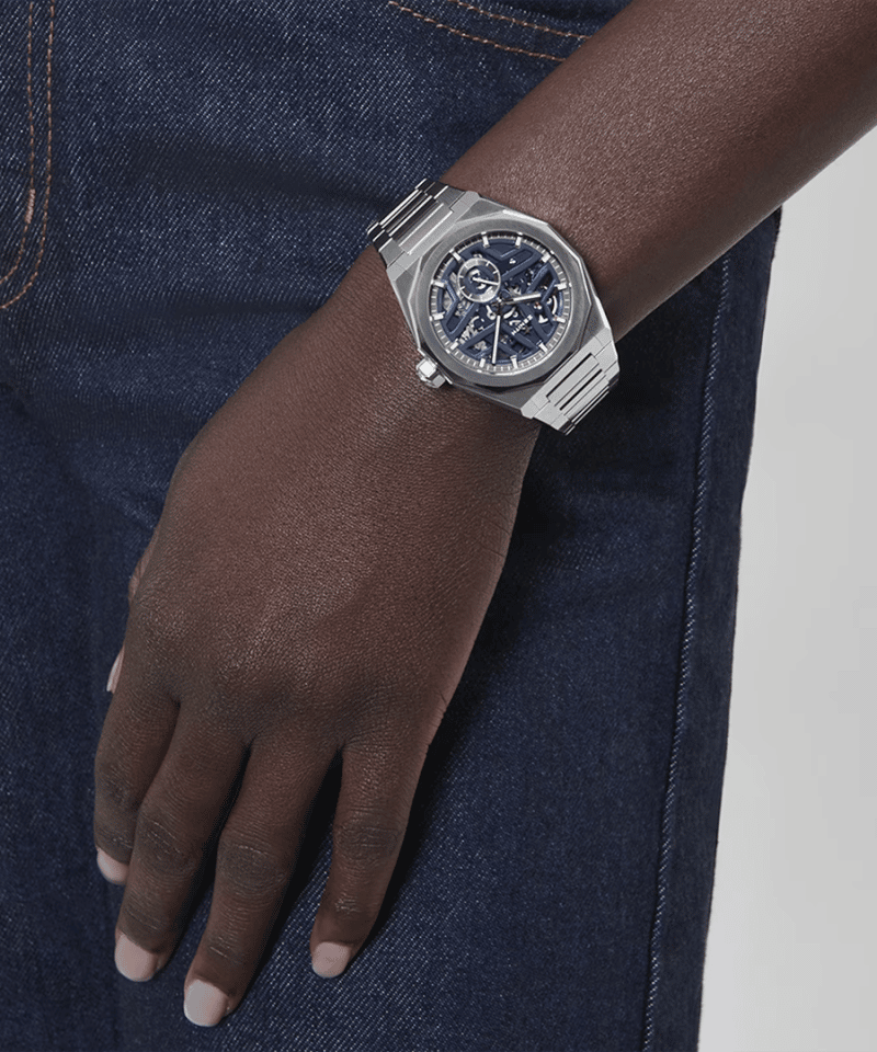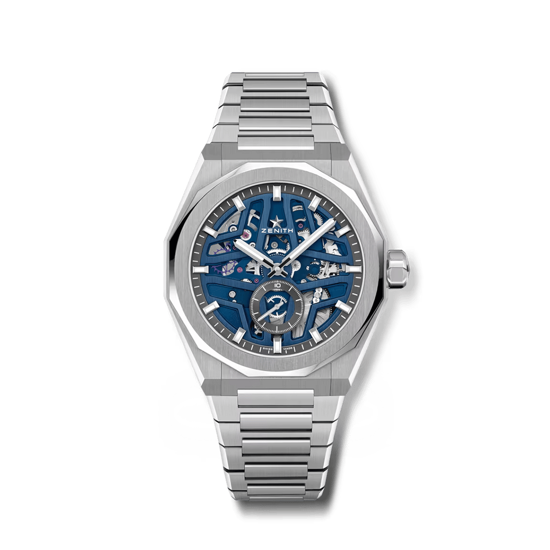 Defy Skyline Skeleton i en 41mm åttekantet kasse av stål med en fasettert bezel, med en blå åpen tallskive som gjenspeiler den symbolske Zenith stjernen. Drevet av El Primero 3620 SK, et høyfrekvent automatisk in-house skeletonurverk med verdens aller første 1/10-sekundsteller. Leveres med utskiftbart stålarmbånd og blå gummireim.